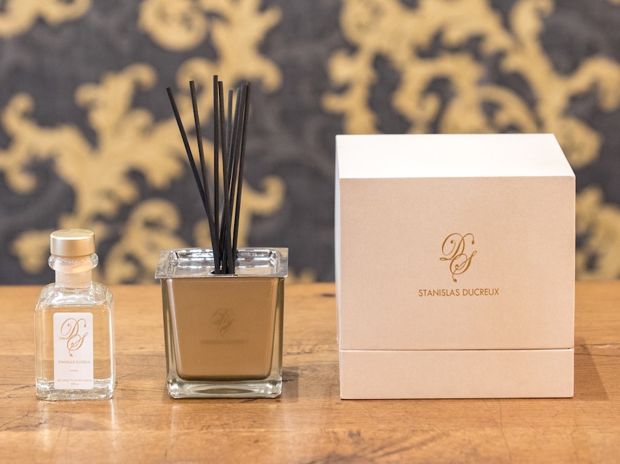 Coffret senteur Diffuseur de parfum d’ambiance personnalisé Stanislas Ducreux, avec 1 lot de bâtonnets de diffusion et 2 recharges. Fragrance Cachemire